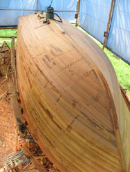 Kew is a tough timber and plywood medium speed fishing or work boat. Speed about 11 knots with 88hp engine. To 15 knots with modern lightweight diesel to 150hp. 12mm (half inch) ply planking. Layout is forward cabin, wheelhouse and big cockpit with engine box. Hull shape is single chine and construction is conventional plywood on timber frames. The scantlings meet survey requirements. The layout is fairly basic consisting of a large cockpit, an enclosed wheelhouse and 2 berths forward. Kew was designed as a working fishing boat with a speed of about 11 knots in order to reduce transit time to and from the fishing grounds |