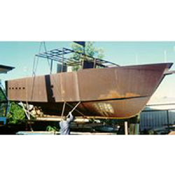 A number of layouts are available based on the standard 34 foot hull. The most popular is Dajarra with permanent berths for 6 persons and a good size self draining cockpit. Eden and Heka are workboats with large cockpits. Minjella a sports fishing boat with accommodation for 4 and large cockpit and Tilba a long distance passagermaker for two persons with a 120hp diesel. 580 litres freaswater. 2:1 reduction gearbox. Conically developed hull plating 5mm thick. Steel is suitable for building in the open. After steel fdabrication the hull can be blasted and epoxy painted. |