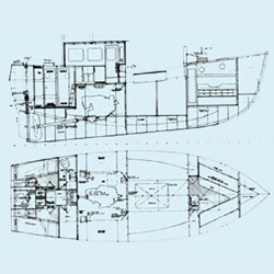 Self contained machinery space. Watertight subdivision. Engine in plan GN 6V 71n. 174hp at 1800rpm. 3:1 reduction gearbox. Propeller 1050mm diameter.