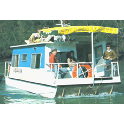 Linda. Very simple yet smart timber and plywood 8.4 metre (26'7) smooth water house boat. Ideal as a get away for two persons. Aluminium version also available Depth of sides 0.94 metres (3'1) Sun area forward 8 foot x 5 foot. Sun area aft 8 foot x 3 foot. Sundeck above cabin 8 foot x 12 foot. Length of house 15'8". Width of house external 7'9". Sleeping cabin forward 7'3" x 6'3". Fresh water 300 litres. Ideal for a 4 stroke high thrust outboard. A 15 hp would be adaquate.