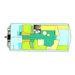11.5 metre steel catamaran houseboat for sheltered water use. Smart and easily built. Rectangular pontoons from standard size 900 and 1200mm wide plate for miniumum draft and maximum freeboard. Stylish and looks superb with a quality yacht finish paint job. A family use houseboat best used as a weekender. Main deck length 10.5 metres. Hull pontoon length 10 metres. Accommodation consists of front sun deck. Steering and saloon space with galley and lounge (also use as sleeping berth). Shower toiler. Two double berths. Aft sun deck. Sunroof with secondary steering if required.