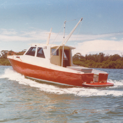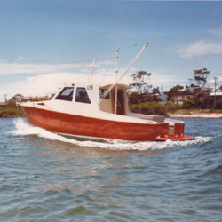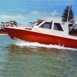 Bollard series 114. Smart inboard diesel chine planing hull. Speed to about 18 knots. Twisted waterplane with reasonably flat transom. Designed for medium speed range to give good fuel economy. Photo says it all, a great little boat This medium speed aluminium workboat is based along the lines of the North American lobster boats, where the operating speeds vary from displacement speed to semi displacement speed and the transition between them is smooth and without the excess hump speed experienced in deep vee hulls.